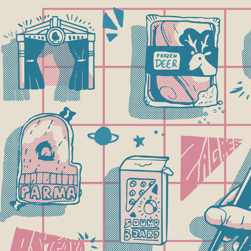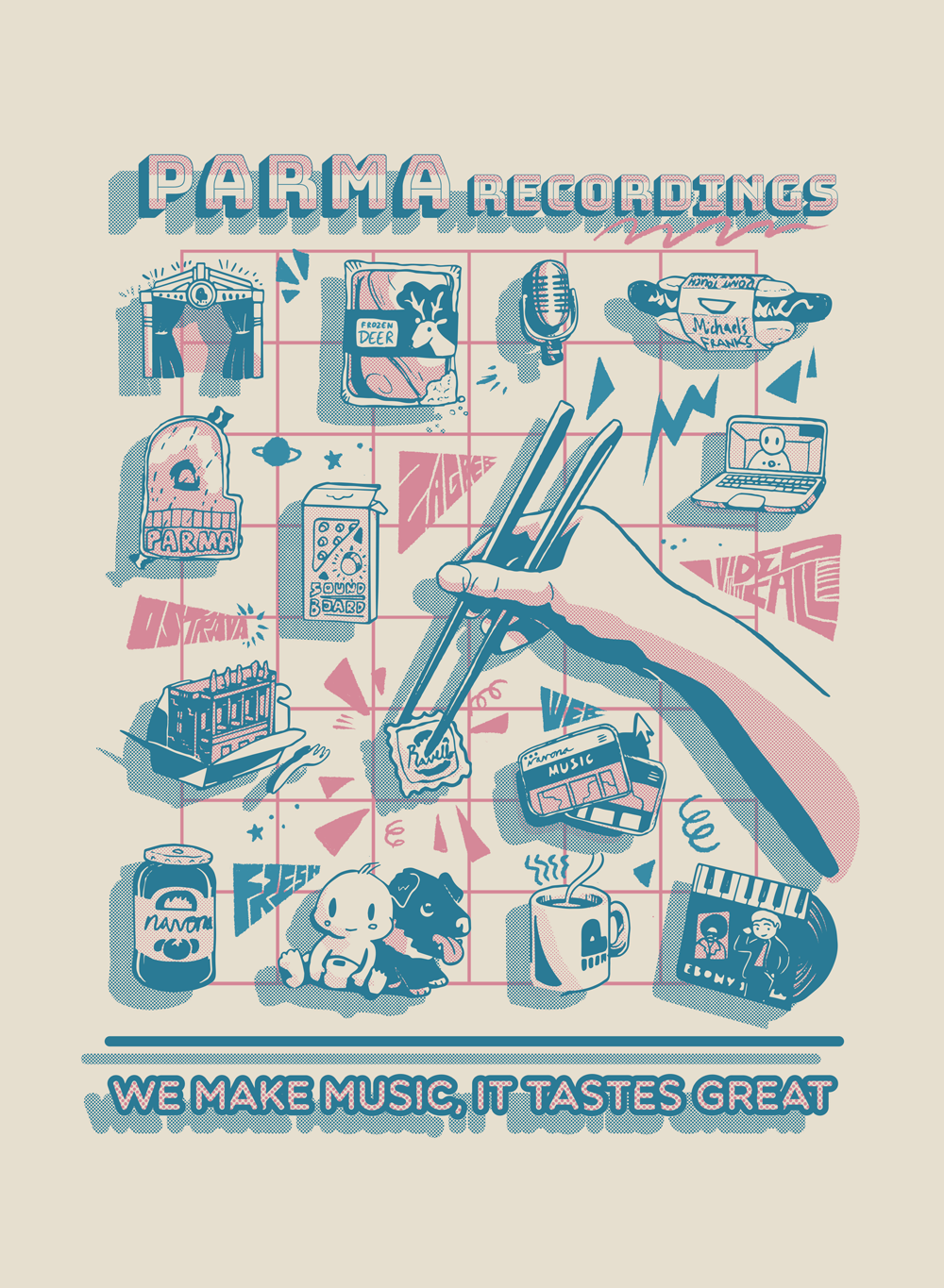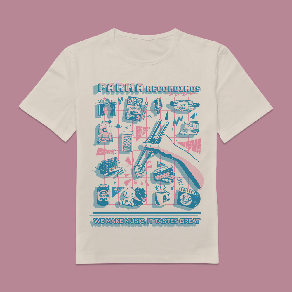 A shirt design made for PARMA Recordings. Limited to two colors, with halftone patterns for style.